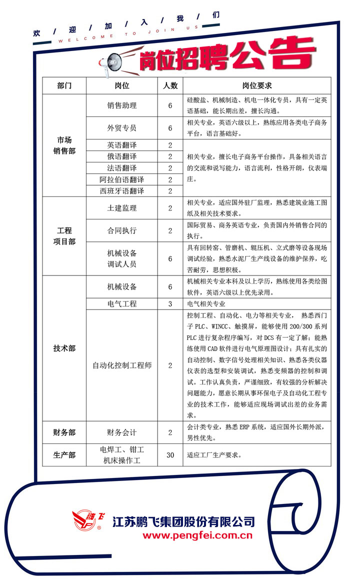 江苏鹏飞集团股份有限公司2019年招聘公告